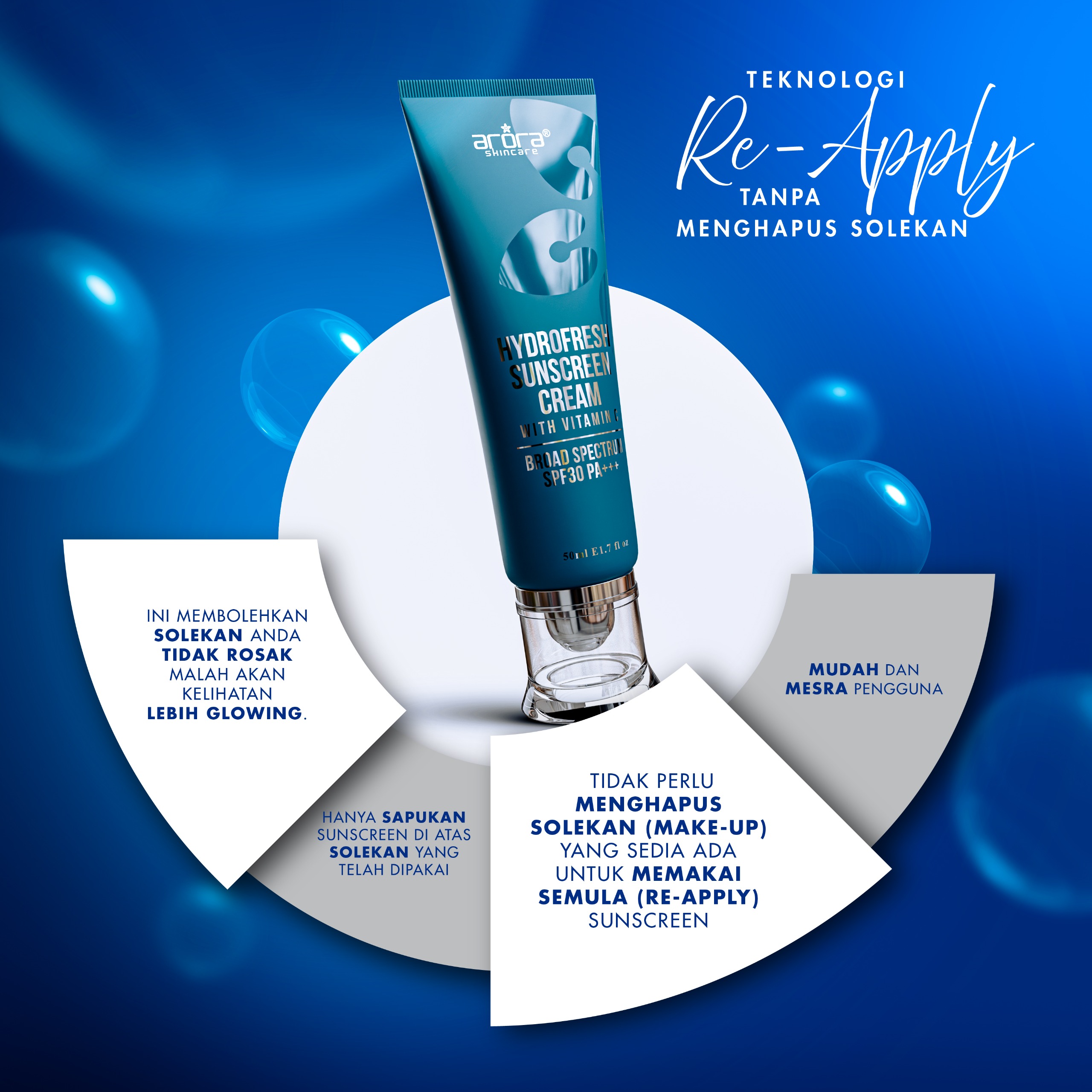 Tak perlu cuci atau buang makeup bila nak sapu semula sunscreen — sapu je atas makeup, tetap smooth & glowing tanpa bercapuk.
